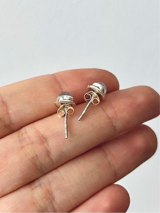 PENDIENTES MINI DE PIEDRA LUNA – PLATA DE LEY 925 Delicados pendientes mini de botón con cabujones de Piedra Luna. Cada pieza está montada en Plata de Ley 925 con cierre de mariposa. La Piedra Luna está vinculada a la calma y equilibrio de nuestras emociones, que potencia nuestra parte femenina e incrementa la intuición. La Piedra Luna se asocia con la luna, que es un símbolo de feminidad, fertilidad y transformación. 📋 Características: • Medida del cabujón: 5 mm • Medida total del pendiente: 7 mm 📦 Realizamos envíos a partir de 15€ de compra.