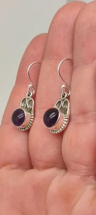 Elegantes pendientes elaborados en Plata de Ley 925 con una hermosa amatista engastada. - Diseño delicado y atemporal. - Cierre de gancho seguro. - Detalle de bolitas en la parte inferior.