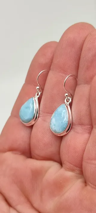 Elegantes pendientes elaborados en Plata de Ley 925 con una hermosa piedra de Larimar. - Diseño con forma de lágrima. - Cierre de anzuelo seguro.