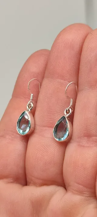 Bonitos pendientes de plata de ley 925 y Topacio azul. Medida 2,4×0,8 cm con el enganche. Se entregan con bolsita para regalo.