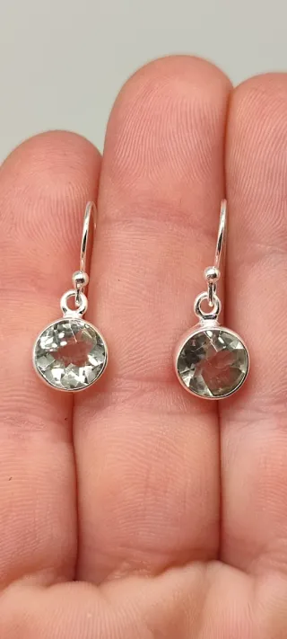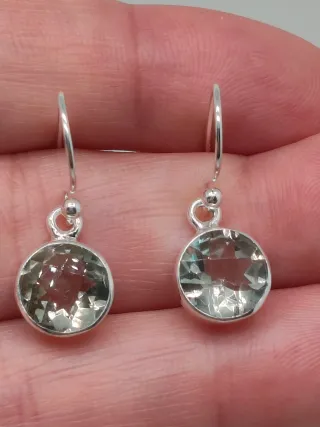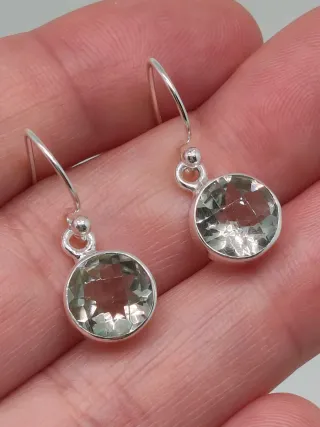 Elegantes pendientes elaborados en Plata de Ley 925 con una hermosa prasiolita. - Diseño colgante con piedra redonda facetada. - Cierre de anzuelo seguro y cómodo.
