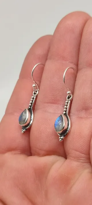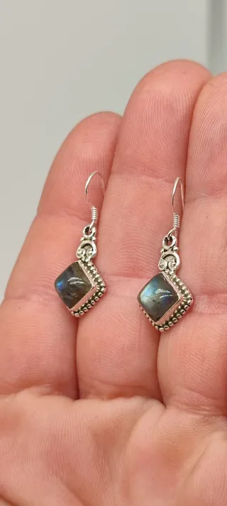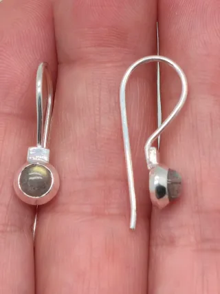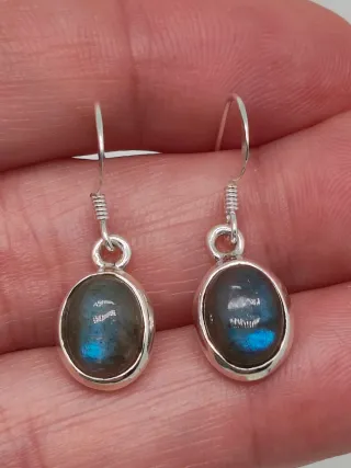 Bonitos pendientes de plata de ley 925 y Labradoritas. Medida 2,9×1,2 cm con el enganche. Se entregan con bolsita para regalo.