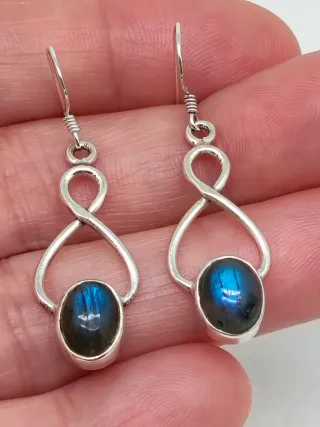 Elegantes pendientes elaborados en Plata de Ley 925 con una piedra de Labradorita. - Diseño moderno con forma de infinito. - Piedra de Labradorita ovalada. - Cierre de gancho.