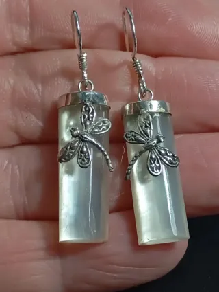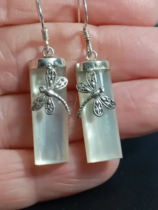 Elegantes pendientes de plata de ley con un diseño de libélula - Colgante rectangular de nácar o similar. - Detalle de dragón en plata. - Cierre de anzuelo.