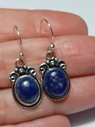 Elegantes pendientes elaborados en plata de ley con una piedra semipreciosa de lapizlazuli - Diseño ovalado con detalles ornamentales. - Cierre de anzuelo para mayor seguridad.