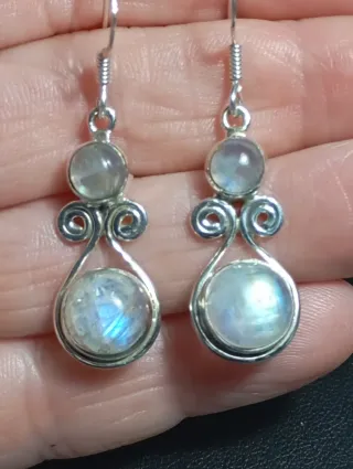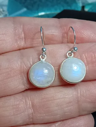 Elegantes pendientes colgantes de plata de ley con piedra lunar. - Diseño redondo. - Cierre de anzuelo.