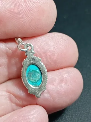 Colgante de plata de ley con una piedra central facetada que muestra tonos verdes y púrpuras. - Plata de ley. - Piedra con reflejos iridiscentes.