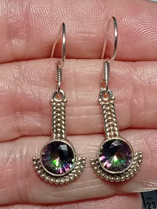 Elegantes pendientes de plata de ley con un diseño único. - Elaborados en plata de ley. - Cuentan con una piedra central de tonos multicolor. - Cierre de anzuelo seguro y cómodo.