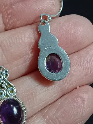 Elegantes pendientes de plata de ley con piedras de amatista. - Diseño ovalado con detalles. - Cierre de anzuelo.