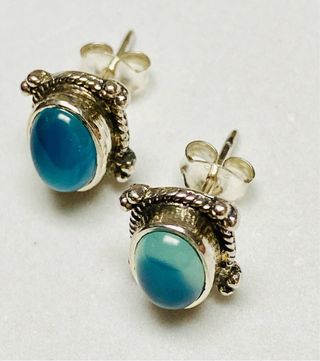 La calcedonia azul es una forma criptocristalina de sílice compuesta de finos intercrecimientos de cuarzo y morganita. La Calcedonia Azul promueve la autoexpresión, la confianza y la autoestima. En joyeria la calcedonia azul es la más preciada de las calcedonias por su rareza y tonalidad con tendencia al azul violeta creándose con ella joyas de gran hermosura. Y con su tamaño idóneo para ocupar centrados el lóbulo de tu oreja el color de las calcedonias azules de estos pendientes artesanales de India en plata de ley 925 destacan maravillosamente creando un conjunto armoniosamente perfecto. Entrega en mano en Valencia y envios por wallapop