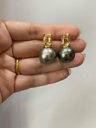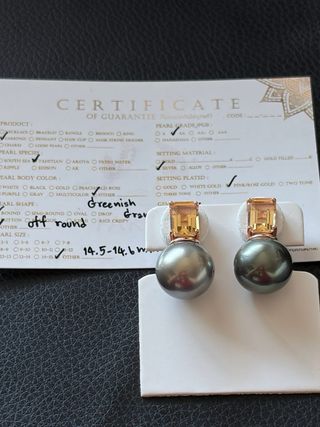 Pendientes de Perla de Tahití Bicolor (14,6 mm) + Citrino (Plata de Ley 925) — Pendientes de perla de Tahití auténtica (con certificado de la tienda). Perlas grandes de 14,5-14,6 mm, de color gris verdoso/bicolor, ligeramente redondeadas y con un brillo excepcional. Montura de plata de ley 925 con baño de oro rosa. Gema: Citrino. Condición: Ligeros arañazos en el lateral (ver fotos). Incluye certificado
