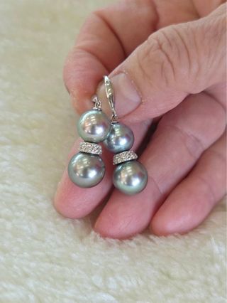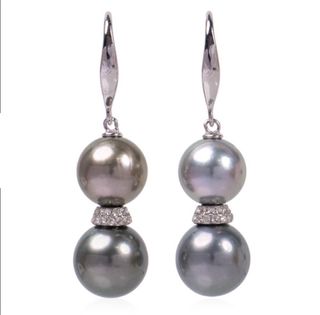 Pendientes Tahitian Pearl 9–10mm (4 perlas) + White Topaz | plata 925 Pendientes tipo gancho (fish hook) con diseño doble perla (dumbbell). Perlas Tahitianas color fancy, tamaño 9,0–10,0 mm, forma casi redonda–redonda (off-round/round). Lustre: excelente | Grado: AA–AA+ | Superficie: ligeramente/moderadamente moteada (según la naturaleza de la perla). Montura en plata de ley 925 con baño de rodio y topacio blanco natural (White Topaz). Solo queda 1 unidad, es la última pieza.