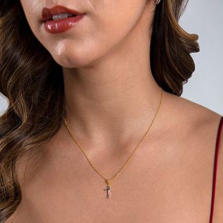 Conjunto Cruces. Engastado manual con circonitas cúbicas de diferentes colores. Acabado brillo chapado Oro 18 Klt. Pendientes cierre presión, Medidas 11 x 7 mm. Gargantilla con cadena Veneciana de cuatro caras de 1 mm y cierre reasa, medida 42 cm. Medida cruz colgante 14 x 9 mm.