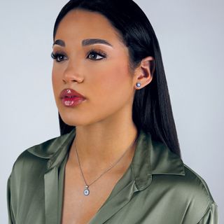 Conjunto Ojo Turco. Engastado con circonitas cúbicas. Acabado brillo. Pendientes cierre presión, Diámetro 7 mm. Gargantilla con cadena Rolo de 1 mm y cierre reasa, medida ajustable de 43 a 45 cm. Diámetro colgante 11,5 mm.