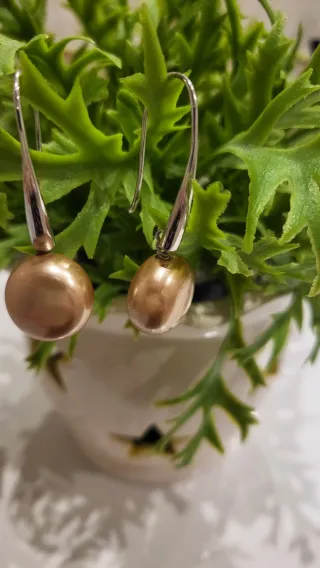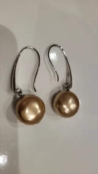 Elegantes pendientesde plata de ley 925 con perlas de un tono dorado nacarado y ganchos plateados. - Diseño colgante. - Acabado brillante en las perlas.