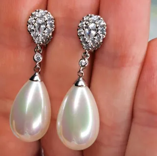 Pendientes de perla blanca (9,5 mm) con diseño “wing” y circonitas (CZ). Perla con mucho brillo/lustre, calidad AAA. Montura en plata de ley 925, muy elegante y favorecedor (ilumina la cara). Ideal para trabajo, eventos o regalo. Detalles: • Perla: blanca, aprox. 9,5 mm, forma redondeada • Calidad: AAA • Material: plata 925 • Piedras: circonitas (CZ)