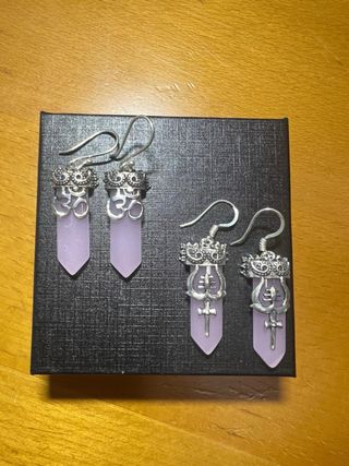 Pendientes de cuarzo rosa, un modelo de OM hindú y otro de Trishul de Shiva, ganchos de plata, de India. Largo 3’5cm. 25€ cada par