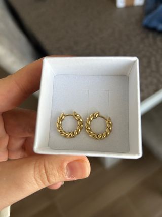 Elegantes pendientes de aro con baño de oro sobre plata, de la marca Qudo. Su diseño trenzado les da un toque especial. Ajustados a la oreja, perfectos para niña. Tienen, literalmente, dos usos, así que están nuevos. Conservan la caja. - Acabado brillante. - Cierre seguro.
