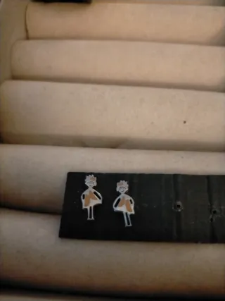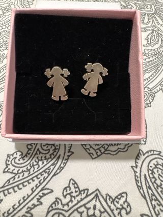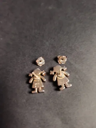 Par de pendientes con forma de niña. - Cierre de presión o tuerca. - Al ser de plata están un poco oxidados pero no se han usado nunca. - Miden unos 1.3cm. -Precio original 95€