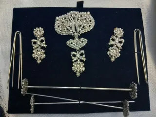 Conjunto de aderezo fallero para niña, con un diseño elegante y delicado. - Pieza central con detalles ornamentales. - Pendientes a juego con forma de racimo. - Broche adicional. - Horquillas para el cabello.