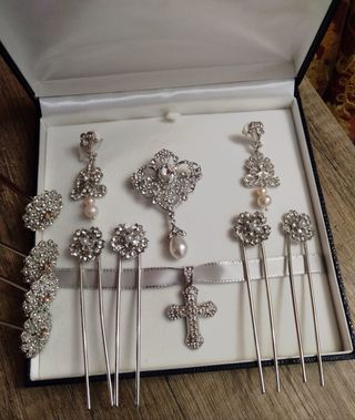 Aderezo para niña en plata, en perfecto estado. - Broche con diseño floral. - Pendientes a juego. - Horquillas decoradas. - Pasador para el pelo.