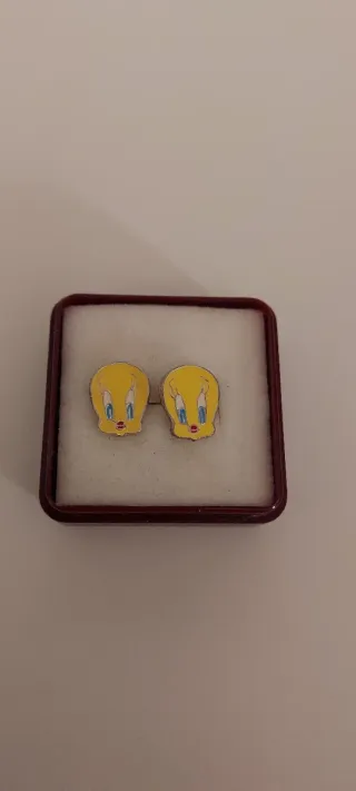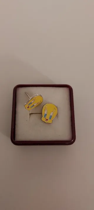 Pendientes con el personaje de Piolín, ideal para niñas a partir de 3 años. Acabado esmaltado. Plateado. Sin tuercas. En caja de joyería.