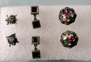 Conjunto de pendientes pequeños con un diseño elegante. - Pendientes con piedra blanca y detalles plateados. - Diseño de flor con múltiples gemas de colores y detalles oscuros. - Pendientes colgantes con forma de cubo y piedra morada. En perfecto estado
