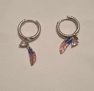 Pendientes de aro con un diseño delicado de pluma y corazón. - Cierre de aro seguro. - Detalle de pluma esmaltada en tonos rosa y morado. - Pequeño corazón con piedra rosa. - Acabado plateado. - Lleva sello de autenticidad plata s925.