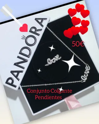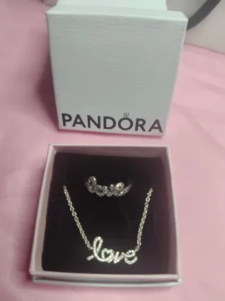 Conjunto de joyería de la marca Pandora con el diseño LOVE. - Colgante con la palabra love adornada con pequeñas piedras. - Pendientes a juego con la misma palabra love y piedras. - Cadena fina de plata. - Cierre de mosquetón. - Plata Primera Ley 925 -Anillo Talla 50