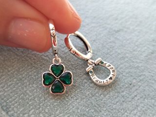 Elegantes pendientes con diseño de trébol de cuatro hojas y herradura de la suerte bañados en plata de ley 925 con el sello grabado y antialérgicos. Los detalles en forma de corazón y las pequeñas gemas verdes añaden un toque especial. Sin uso. Más en mi perfil. Se envían con bolsita de regalo.