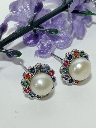 Pendientes Perla De Plata De Ley 925 cultivadas con circonitas autenticas rodeadas de colores -Modelo clasico -ideal para un regalo -Nuevo a estrenar -con su caja pequeña de regalo -Diametro: 1.10cm