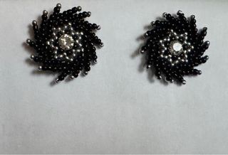 Estos pendientes pequeños tienen un diseño llamativo con pedrería. - Cuentan con un detalle central brillante. - Elaborados con cuentas negras y plateadas. Hecho a mano