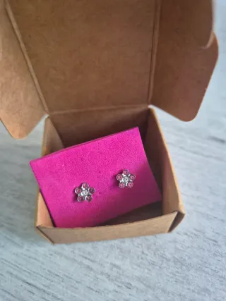 Pendientes con un diseño de flor y pequeños brillantitos. - Nuevos sin estrenar. - Cierre de presión. - Acabado plateado. - Hipoalergenicos. - palito y rosa ideal para niñ@s.