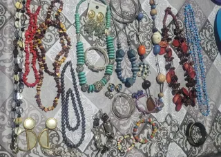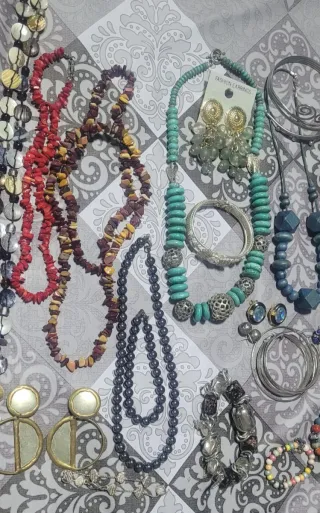 Conjunto de bisutería variada con diferentes piezas. - Collares de cuentas y piedras. - Pendientes dorados con colgantes. - Pulseras de eslabones y cuentas. - Brazalete plateado con diseño. - Varios pares de pendientes pequeños.