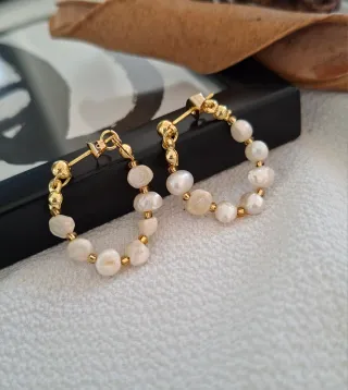 Preciosos pendientes de plata, baño de oro 18k con diseño de aro y pequeñas perlas. Son delicados y elegantes. - Material: Plata. - Diseño: Aro con perlas cultivadas de agua dulce. - Estilo: Elegante y delicado.