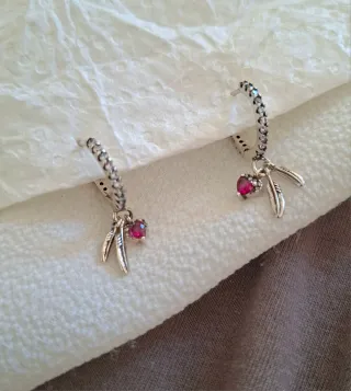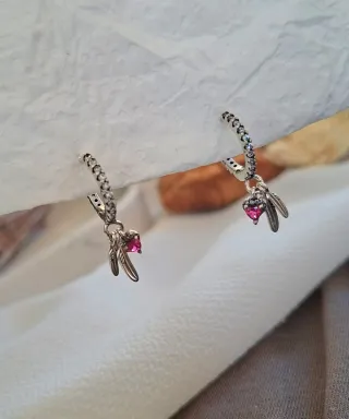 Elegantes pendientes de plata con un diseño delicado. - Colgante de corazón rosa. - Detalle de plumas plateadas. - Aro con pequeñas circonitas.