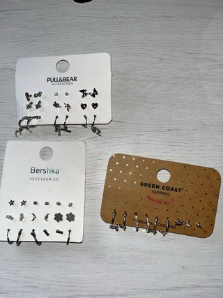 Tres preciosos packs de pendientes en plata. ✨ - Pack Pull&Bear: contiene 12 pares de pendientes. - Pack Bershka: incluye 12 pares de pendientes. - Pack Green Coast: trae 6 pares de pendientes. Perfectos para darle un toque brillante a tu look diario.