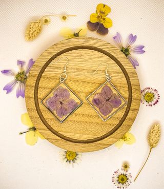 Pendientes artesanales con flor de hortensia preservada en su interior. - Diseño de rombo. - Enganche plateado.