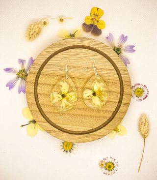 Pendientes únicos con flores naturales preservadas, encapsuladas para mantener su belleza. - Diseño de lágrima. - Flores amarillas y moradas. - Cierre de anzuelo plateado.