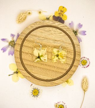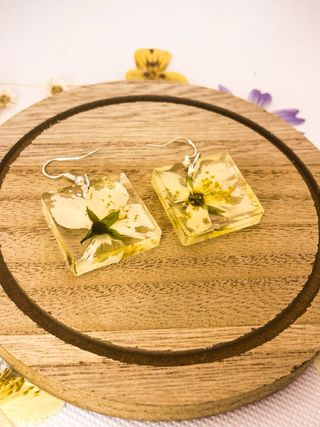 Pendientes hechos a mano con flores blancas y amarillas preservadas en resina. Cada pendiente tiene una forma cuadrada y un diseño único. - Flores naturales encapsuladas en resina transparente. - Cierre de gancho plateado. - Diseño ligero y delicado.