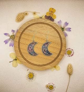 Pendientes con forma de luna creciente, adornados con flores preservadas en tonos morados y azules. El detalle de las flores encapsuladas en resina les da un toque único y delicado. - Diseño de media luna. - Flores naturales preservadas. - Enganche de plata.