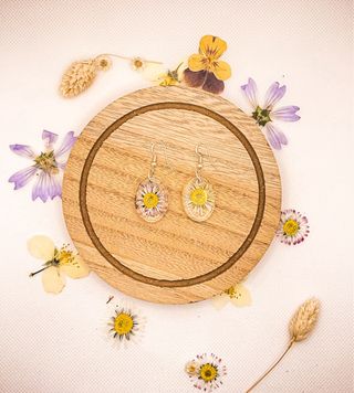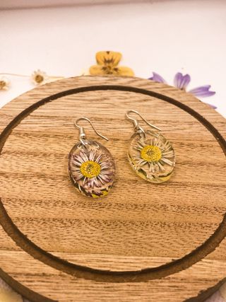 Pendientes hechos a mano con flores de margarita encapsuladas en resina. - Diseño ovalado. - Cierre de anzuelo plateado.