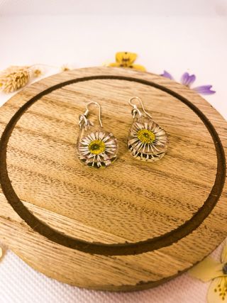 Pendientes únicos con margaritas encapsuladas en resina. - Diseño gota - Cierre de plata. - Flores naturales preservadas.