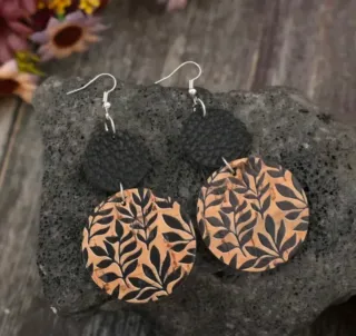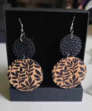 Vendo pendientes de Cuero Negro y corcho. Material principal: corcho. Diseño de hojas en contraste. Cierre de anzuelo plateado. Más modelos en mi perfil. Todos vienen con su cajita. También puedo hacer lotes. Consúltame sin compromiso.