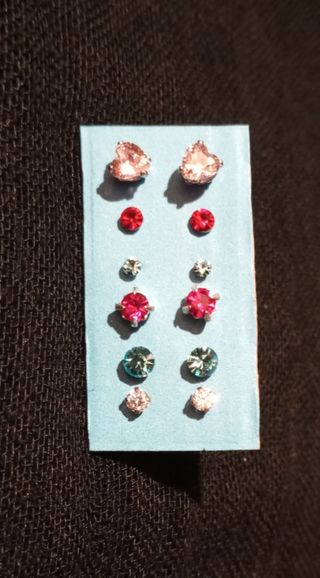 Conjunto de 5 pares de pendientes Hipoalergénicos y de Plata, diseñados para evitar reacciones alérgicas garantizado. Los 3 de arriba son hipoalergénico Los 2 de abajo son plata (925) - Cuentan con cierres de rrosca los hipoalergénicos, ideal peques. - Incluye diseños en forma de estrella, flor y perlas.. - Algunos pendientes tienen detalles de pedrería. Los modelos están duplicados. Son 5 pares 10€