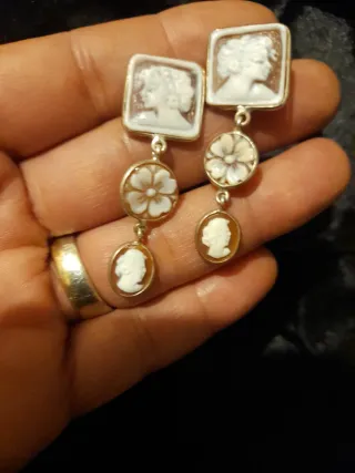 Elegantes pendientes con diseño de camafeo y flor. - Camafeos con perfil de mujer. - Detalle de flor en el centro. - Cierre de plata.