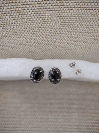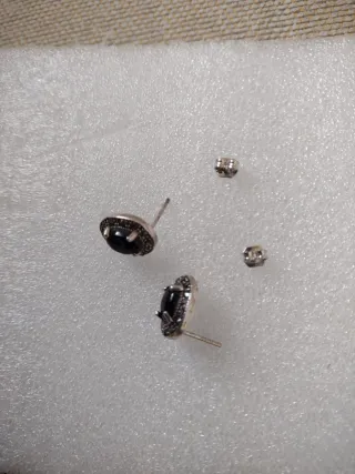 Elegantes pendientes de plata con una piedra central de color negro, rodeada de pequeñas incrustaciones. Más de cosas de plata en este perfil SÓLO VENTA EN PERSONA - Diseño ovalado. - Cierre de presión.