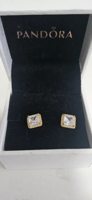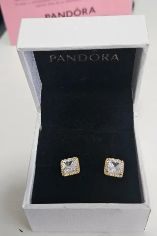 Elegantes pendientes cuadrados de la marca Pandora, con un diseño que combina detalles dorados y plateados. Perfectos para añadir un toque de brillo a cualquier ocasión. Envío en su caja