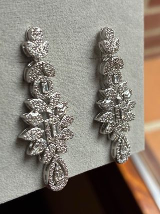 Elegantes pendientes largos con un diseño detallado y brillante. - Diseño tipo chandelier. - Detalles en forma de hoja y lágrima. - Cierre de presión.