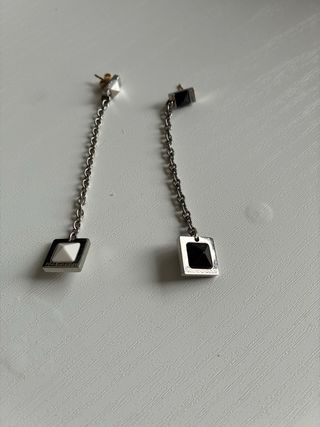 Elegantes pendientes colgantes de la marca Rebecca. - Diseño moderno con detalles en blanco y negro. - Cadena plateada. - Cierre de presión.